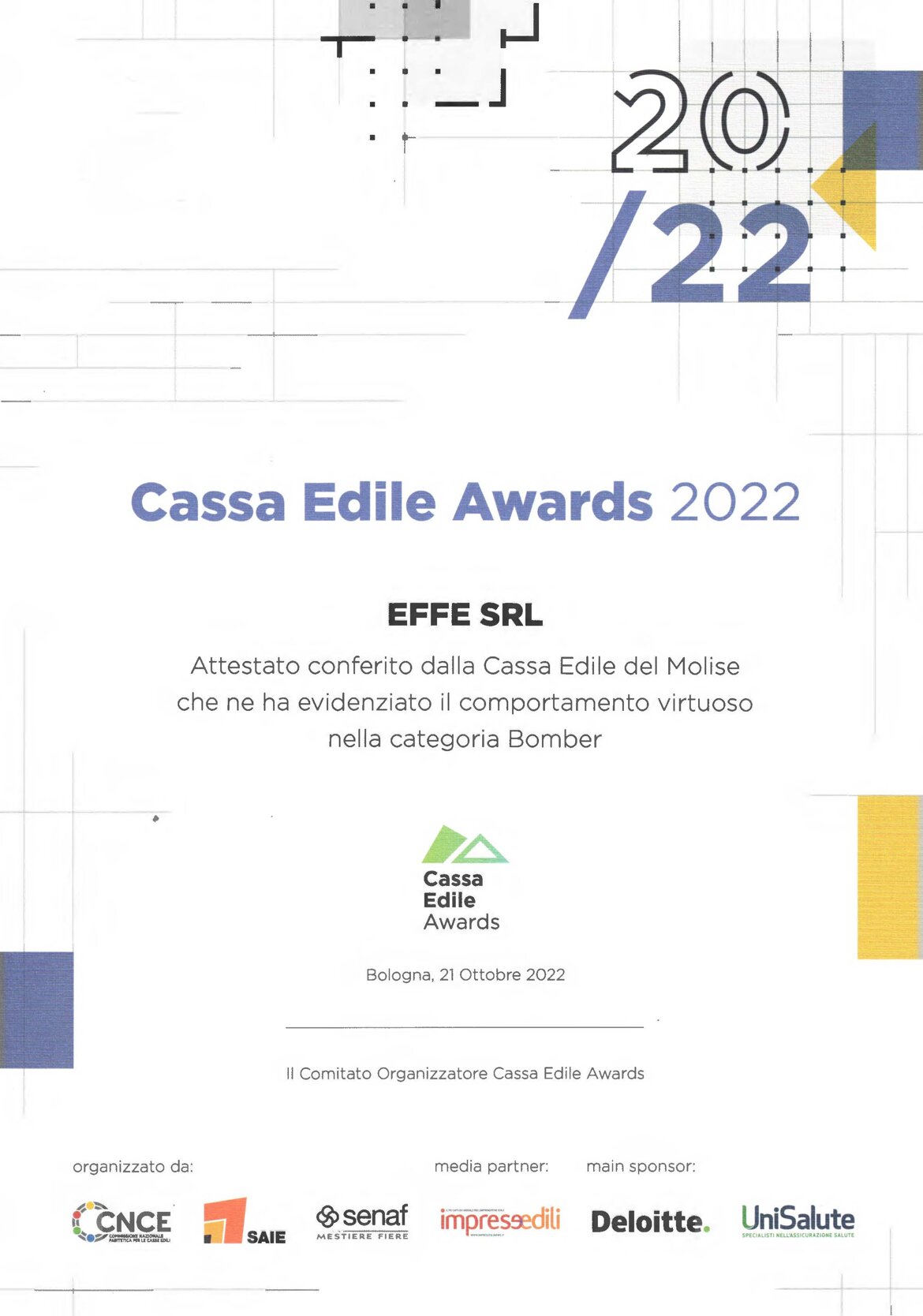 Attestato conferito dalla Cassa Edile del Molise per aver evidenziato il comportamento virtuoso nella categoria Bomber ovvero Impresa regolare iscritta da almeno 5 anni che ha una contribuzione integralmente versata nell’esercizio indicato maggiore di quella dell’esercizio precedente.